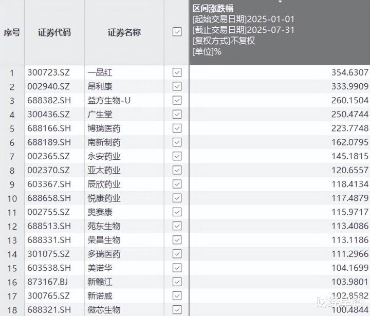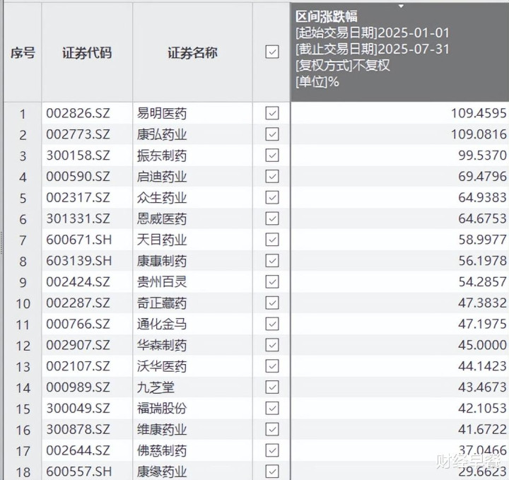 比如化学制药。据Choice统计,今年1月至7月,139只相关股票中(剔除ST),仅有12只股票收跌。